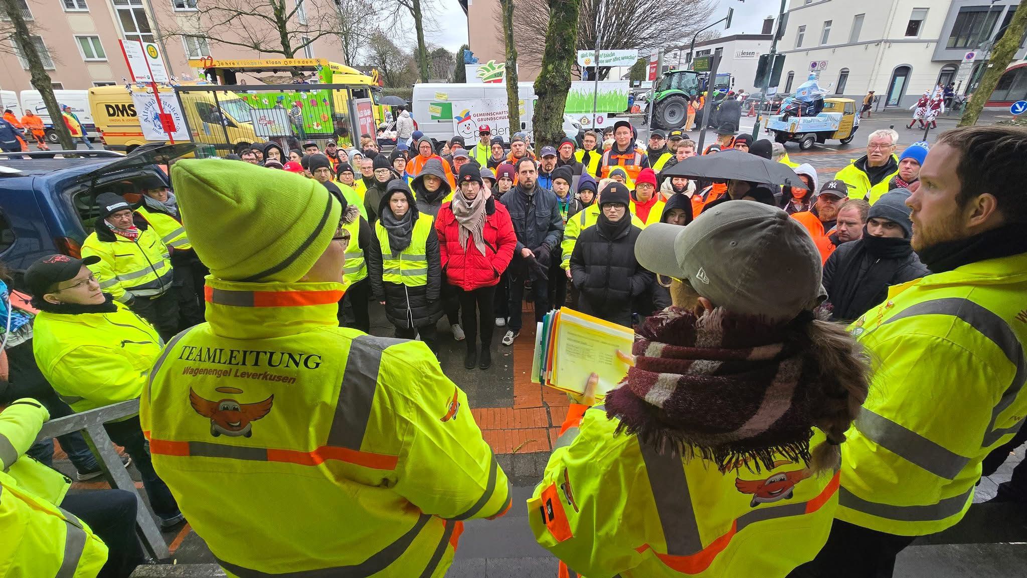 Vorbesprechung und EInweisung der Wagenengel vor dem Karnevalszug in Opladen 2026